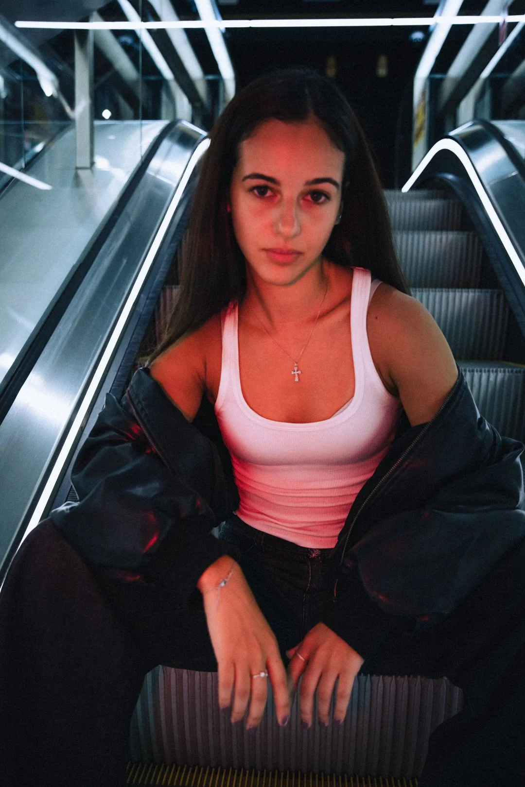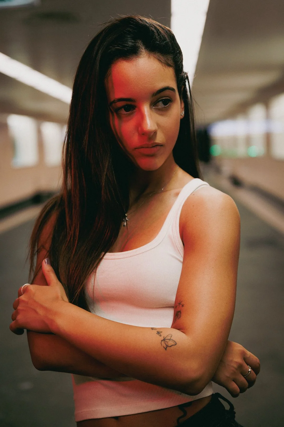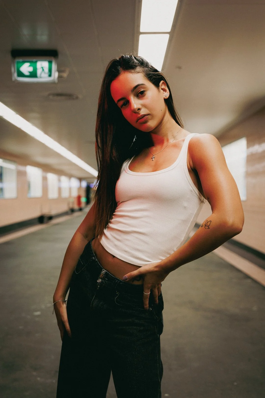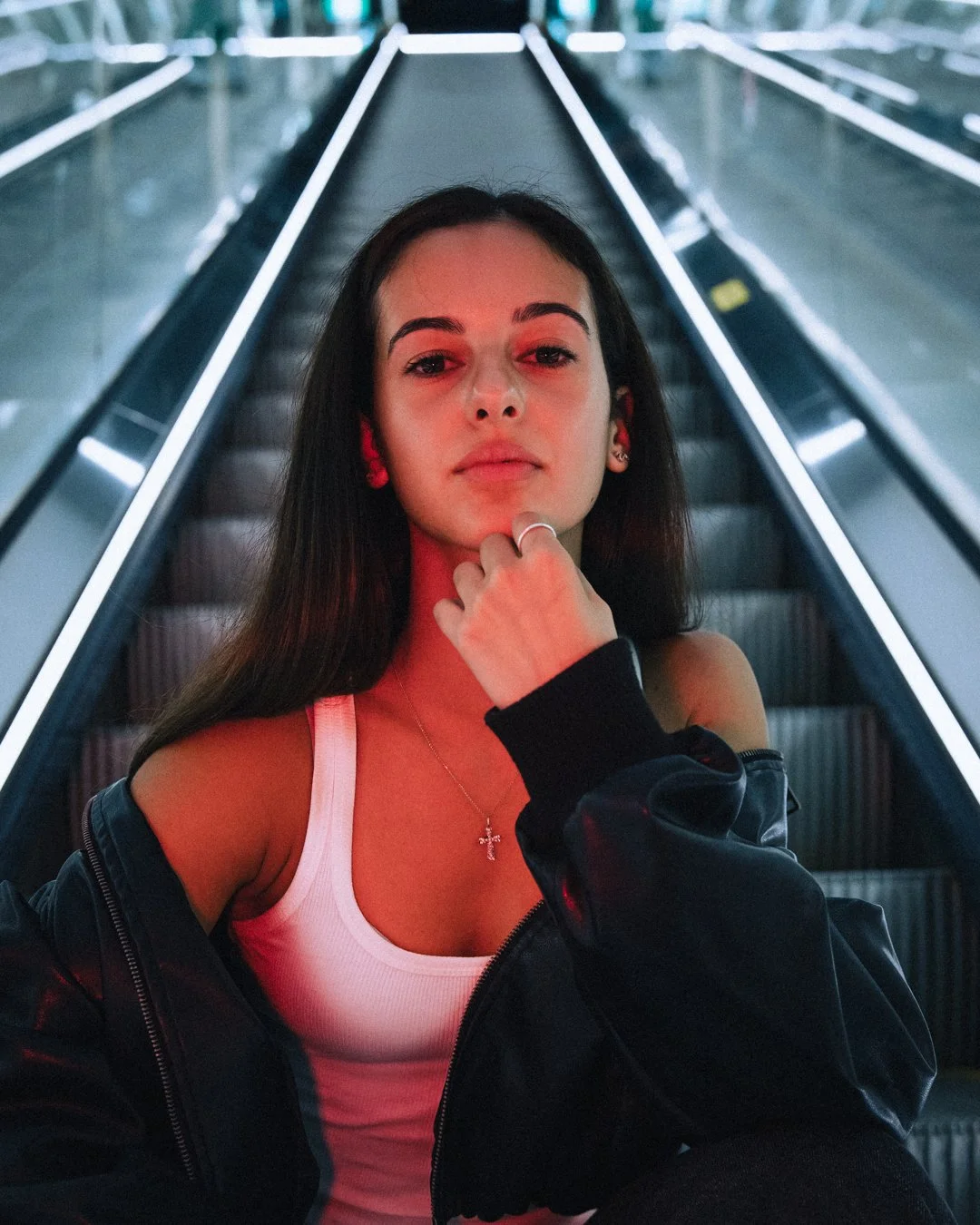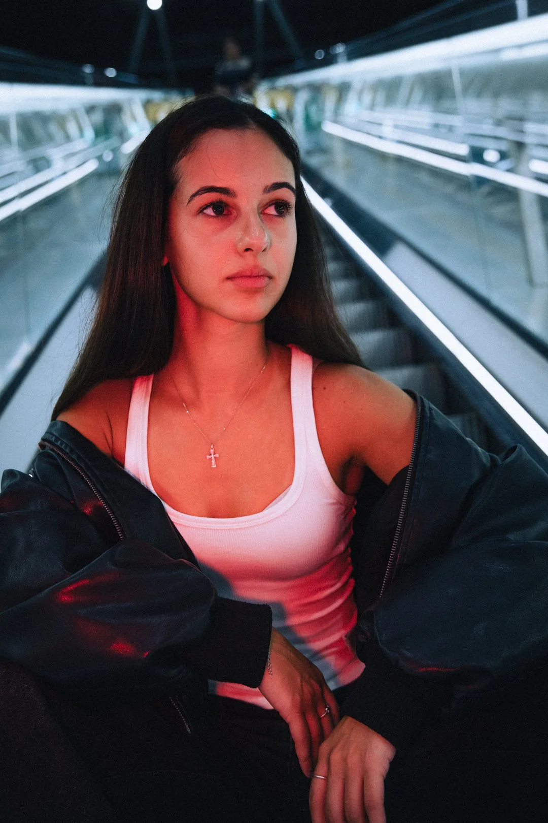 The main challenge we faced was what colour the scene should be setup as, and in post-production fine tuning the colour to enhance the overall tone. I aimed to focus mainly on warm colours such as red and orange, but I also included some “cooler” tones such as purple. Another challenge came in the form of ambient colour light, as it can complement (or sometimes) clash with the main light source you cast on the subject. At around the half way point in the shoot we moved to a subway location that offered a neutral light source, allowing us to use red lights without overwhelming the scene.