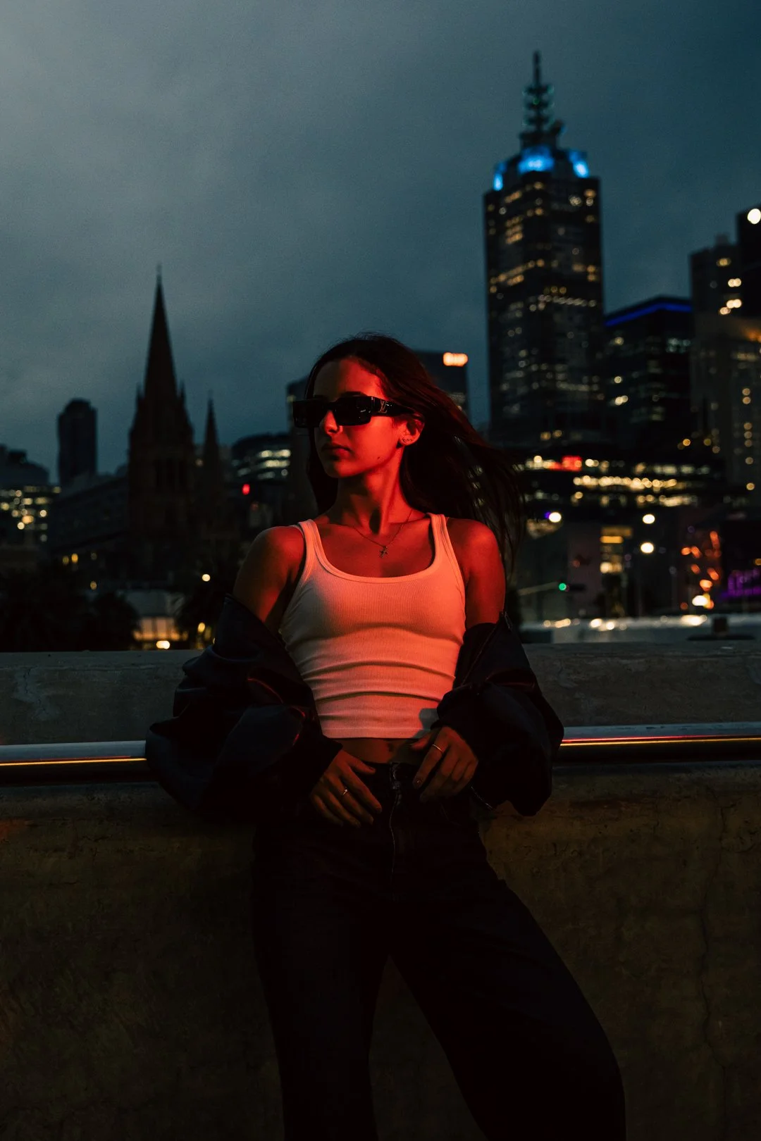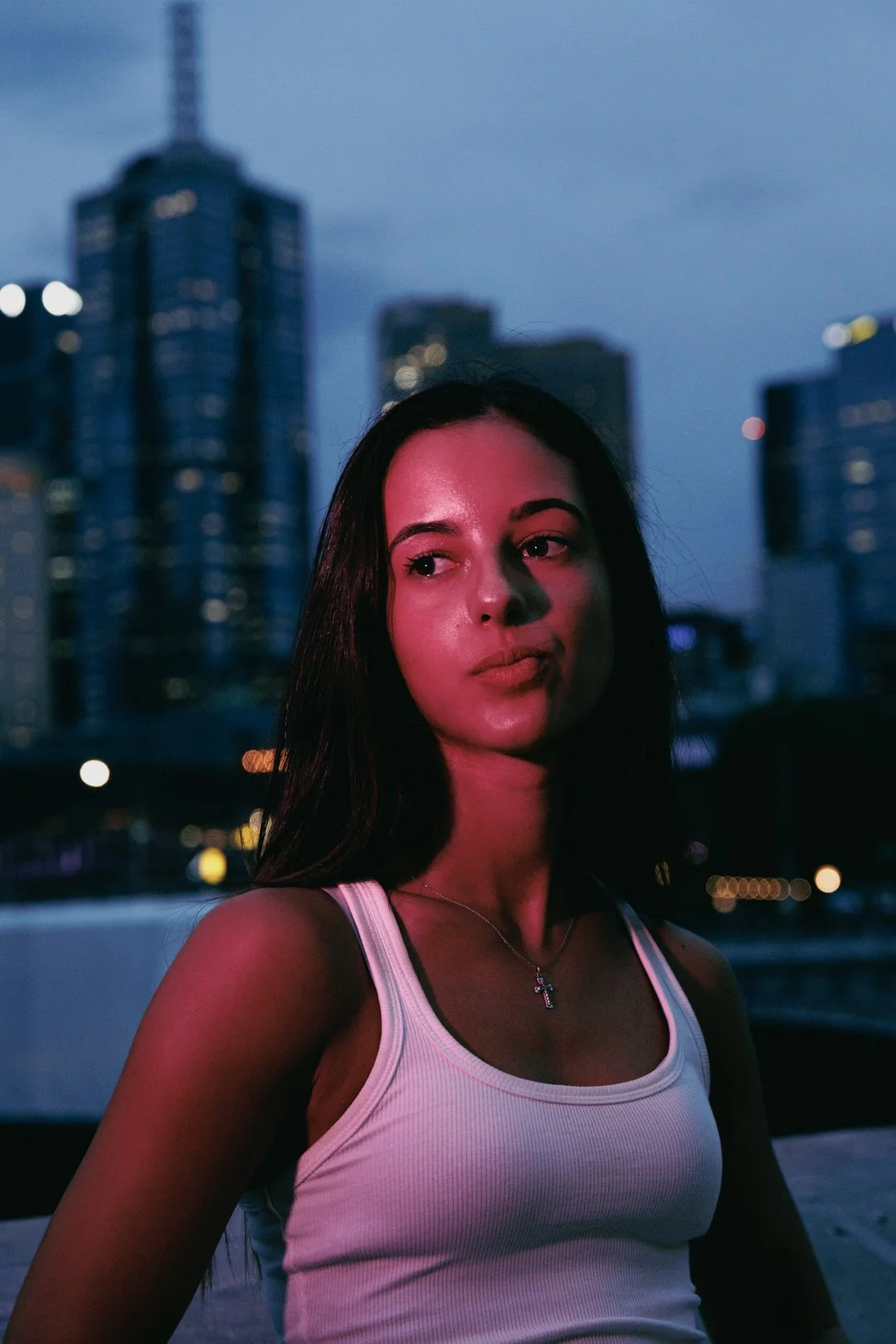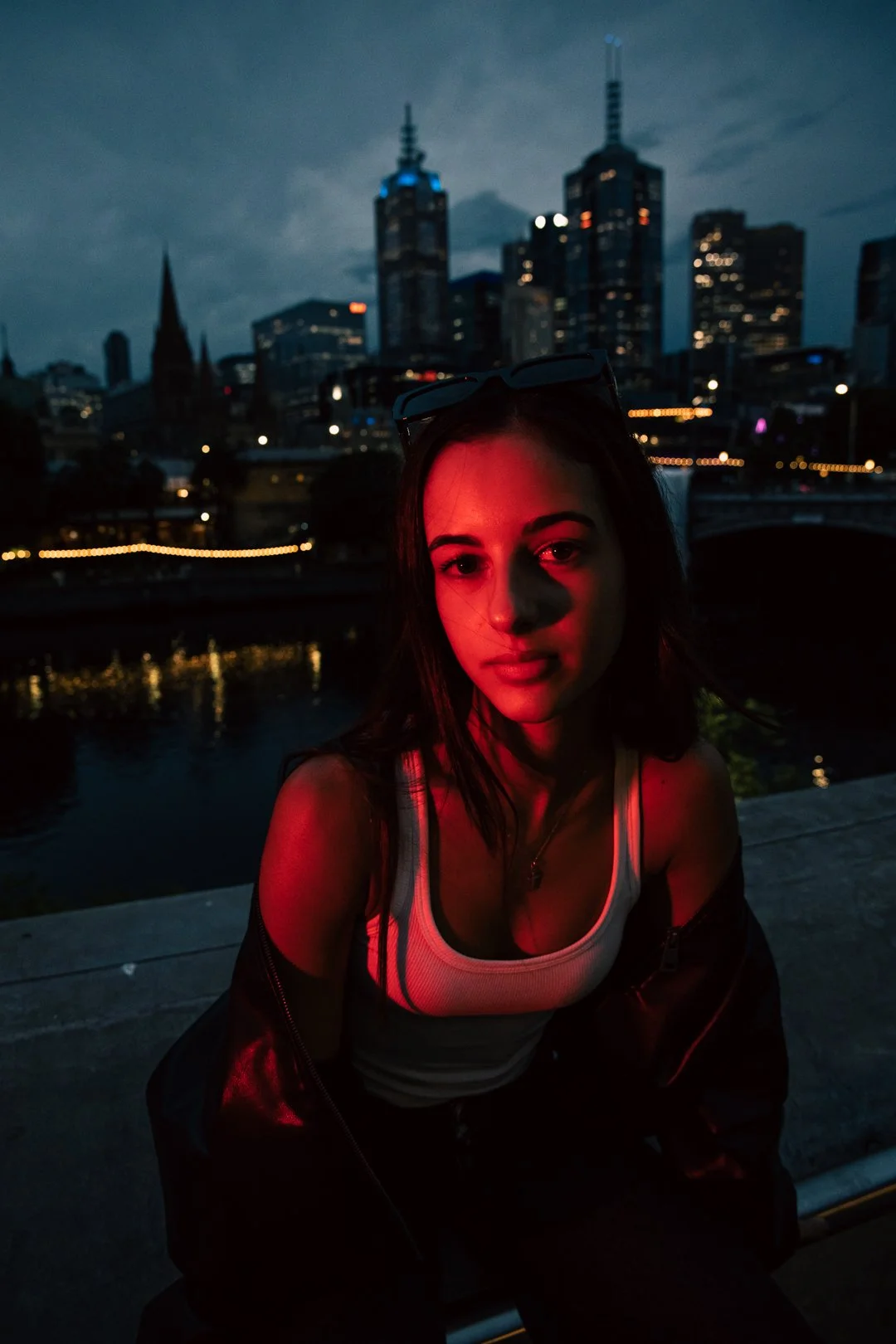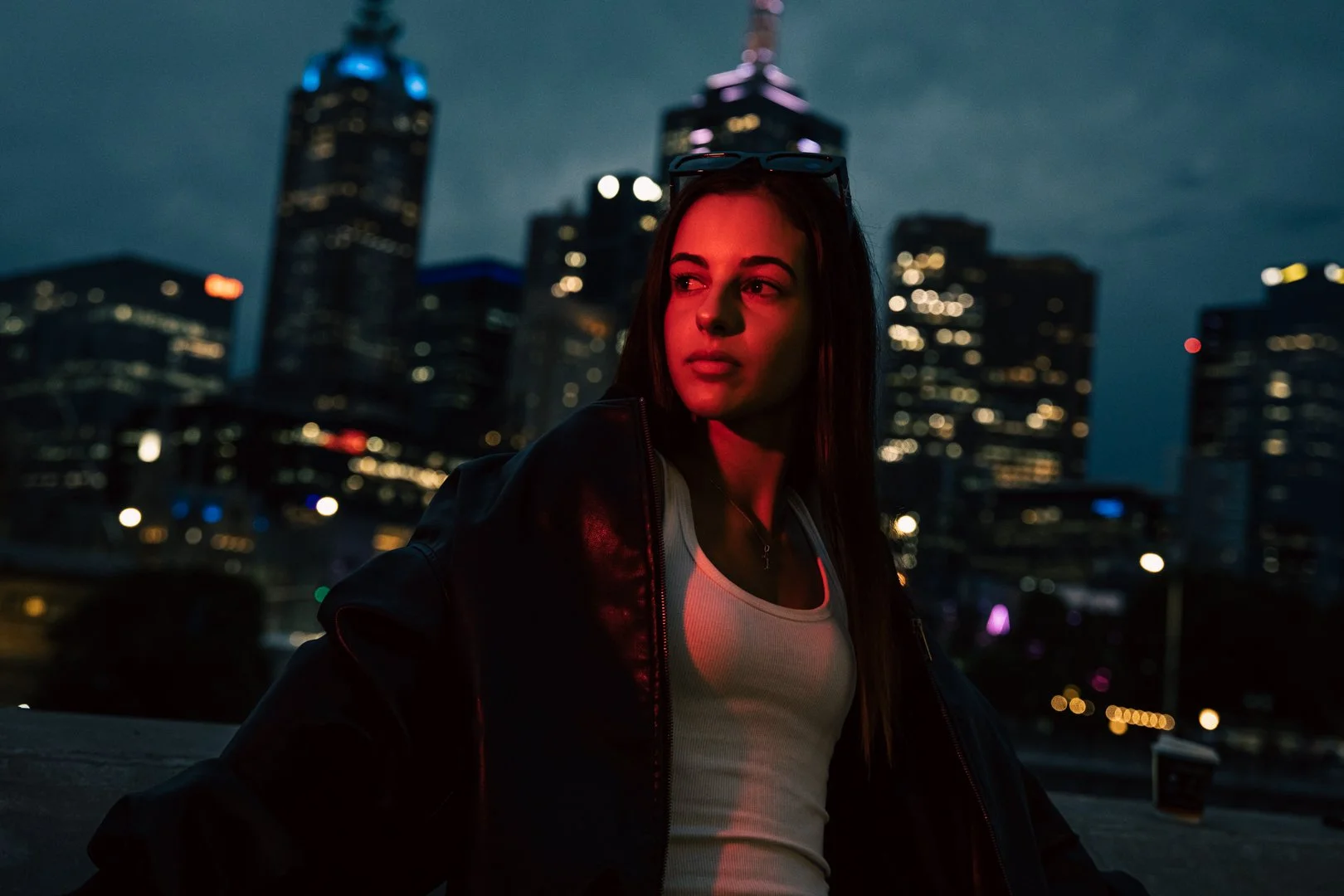 Devi and I had a fairly simple concept in mind. Photograph at night in the city and utilise a portable LED light source to cast light on the subject. Using the lights from buildings in the background and ambient light would help elevate the scene to something hopefully “Cinematic”.