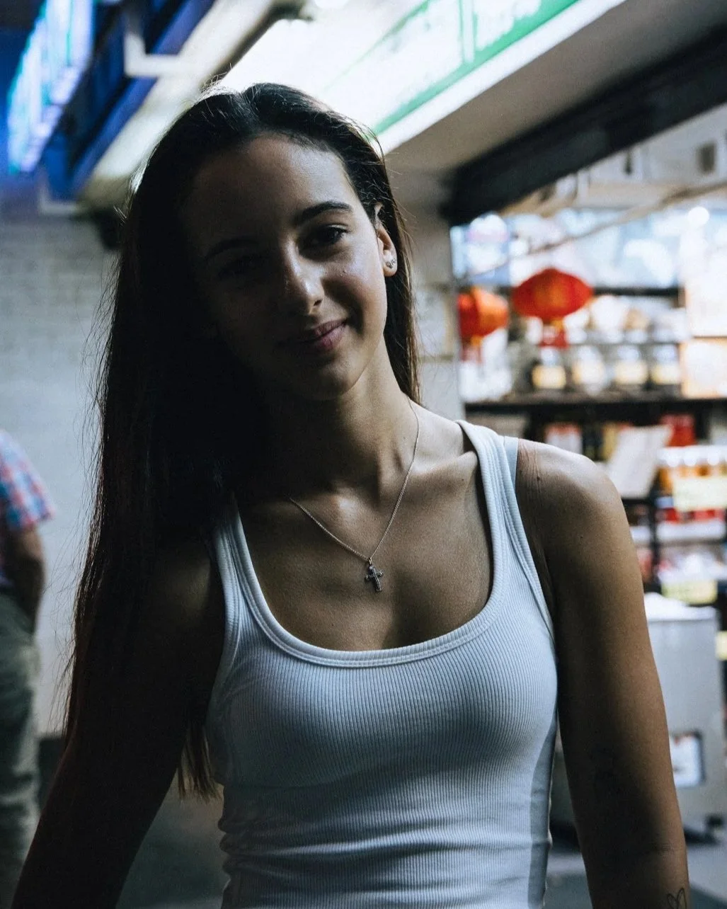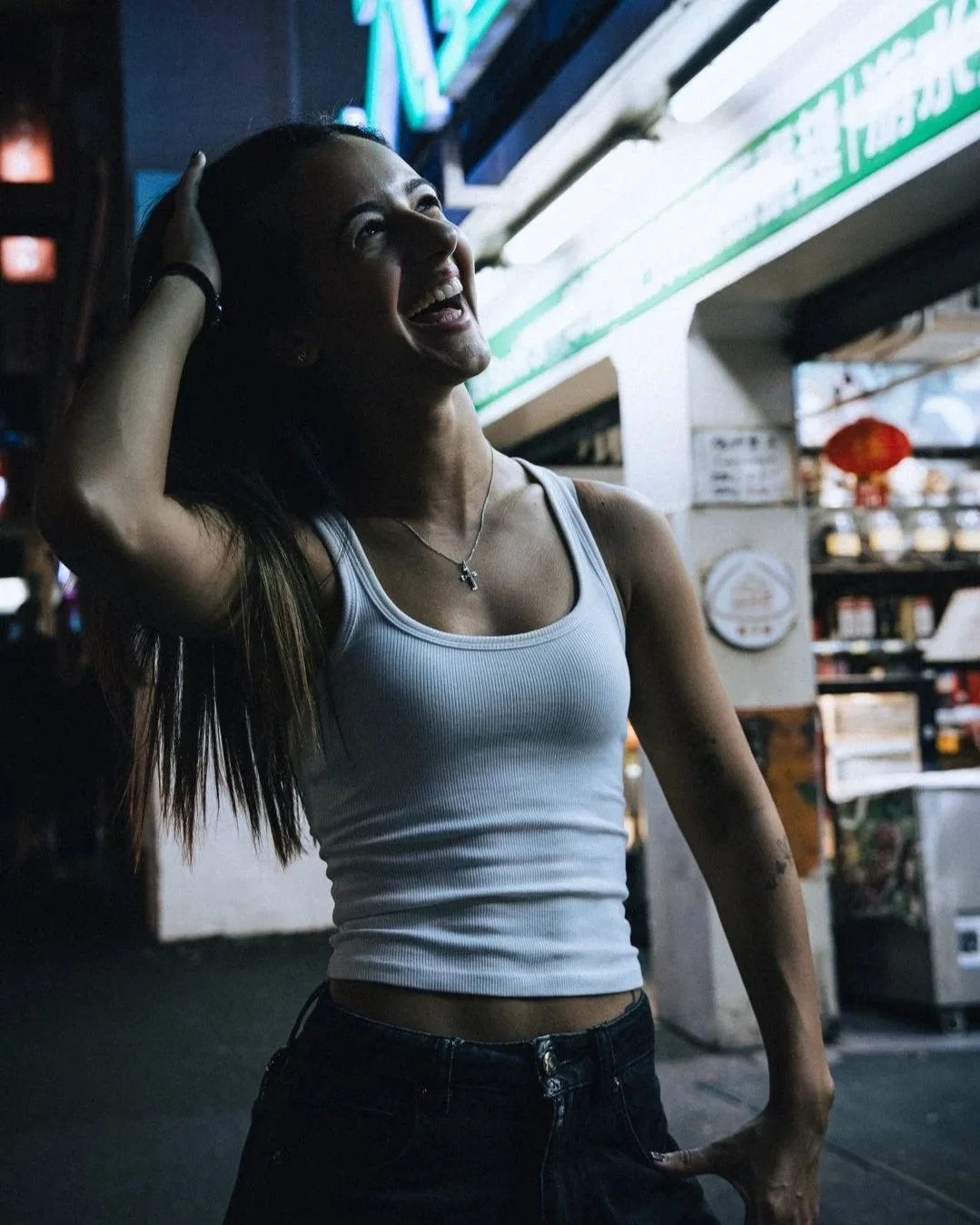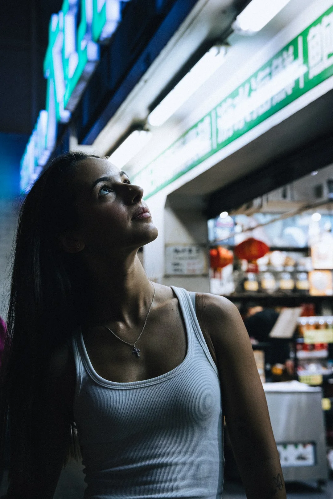 The final location, outside Golden Square carpark in Chinatown, I decided to go for some quick shots using the neon lights from a shopfront sign as the main source of light. Here, I wanted to only use ambient light of the scene and nothing from the portable light I used in previous scenes. It was also fairly easy to decide on using colder tones for this scene, as the night setting and cool neon light colour already set the scene.